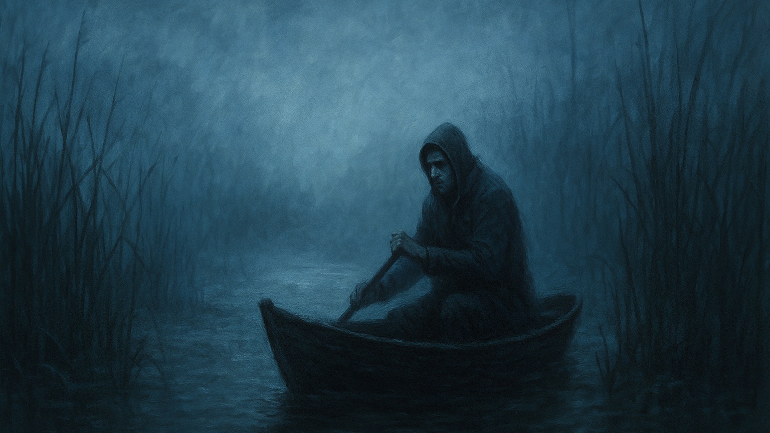 جدف في المشحوف الصغير بيأس رجل فقد رفاقه وسط متاهة من الماء والقصب المتشابك، وقد ارتعشت يداه من التعب والخوف، فالريح العليلة التي تمر عبر القصب تصدر صوتا حادّا، كأنها تهمس له: