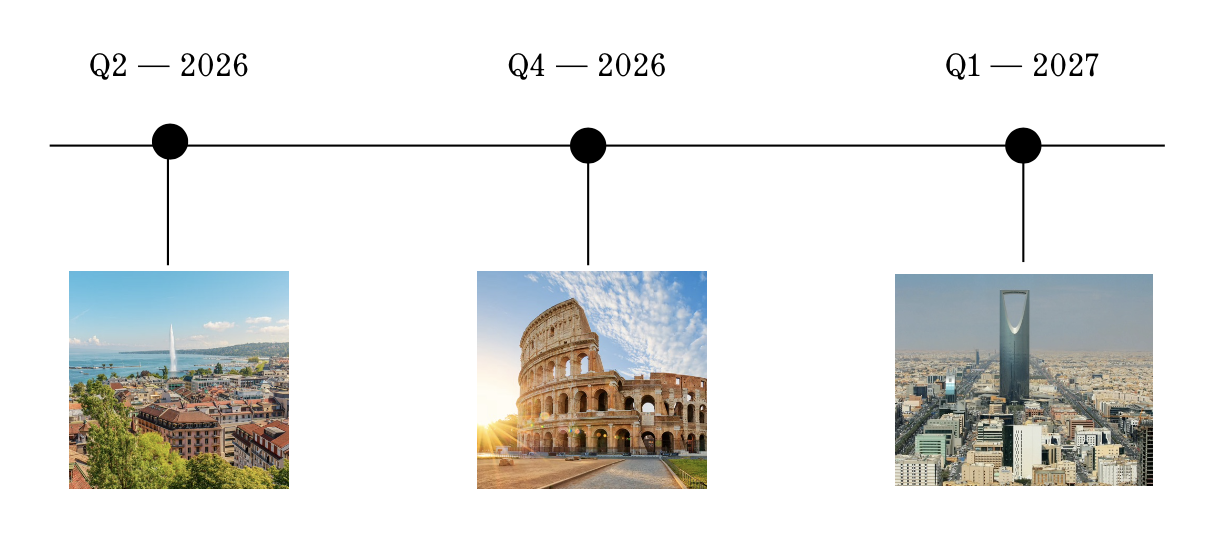 يُخطط للمعرض أن يبدأ في جنيف خلال الربع الثاني من عام 2026، ثم ينتقل إلى روما أو طوكيو في الربع الرابع من العام نفسه، قبل أن يُختتم في الرياض مطلع عام 2027.