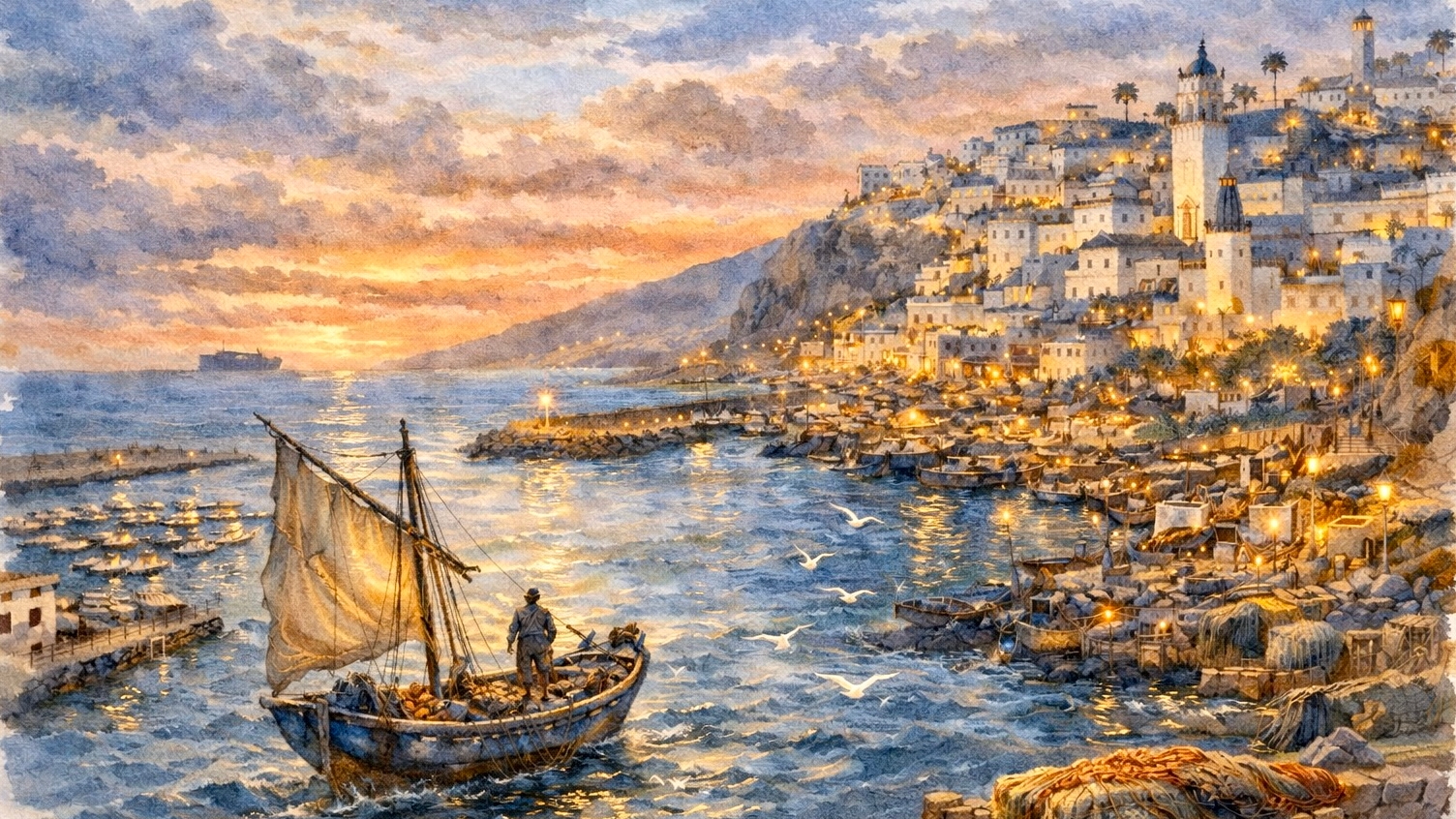 يَدْنُو آخِرُ مَراكِبِ الصَّيْدِ القَديمَةِ،