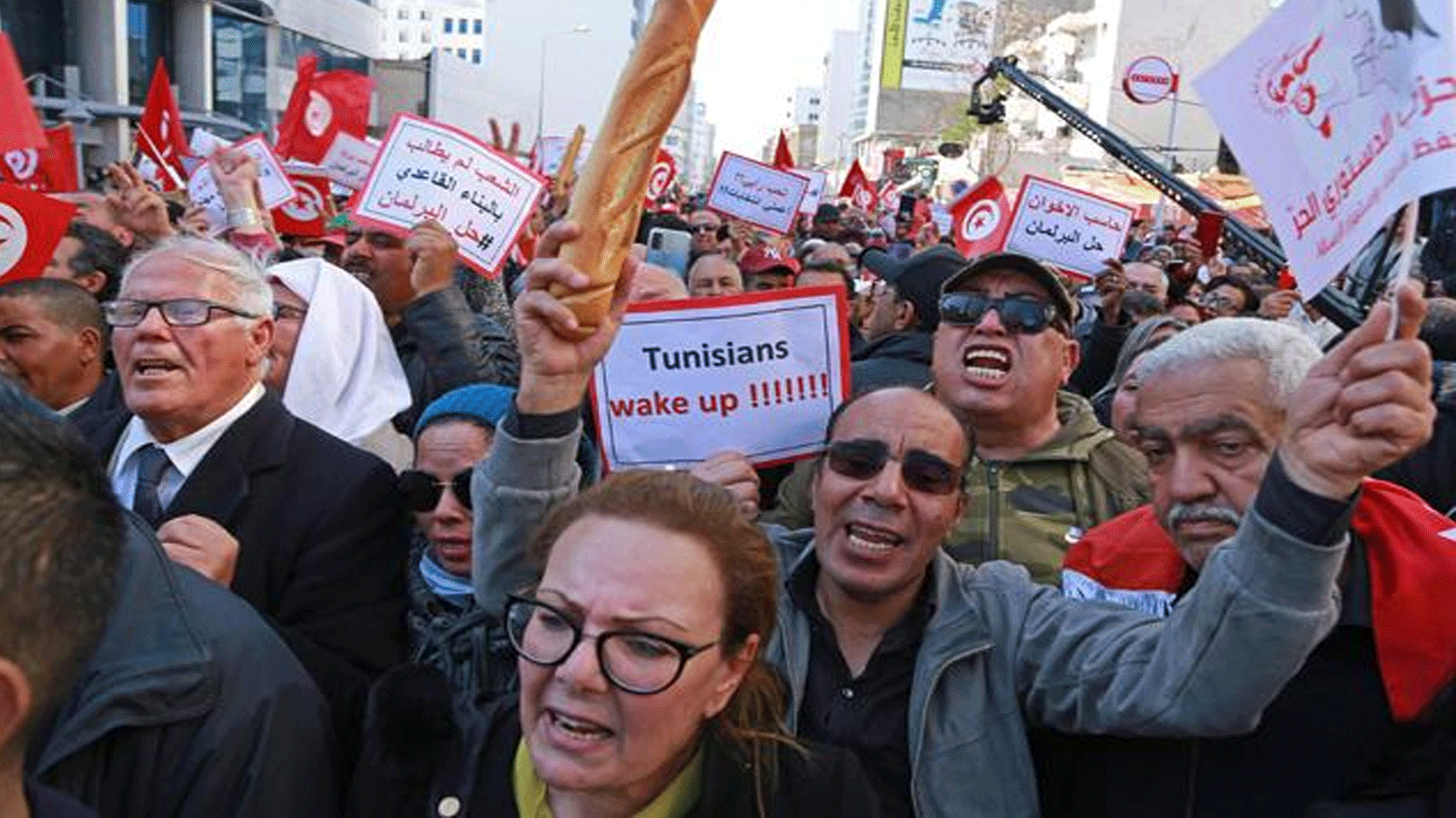 كما رفعوا لافتات كتبوا عليها "تونس على حافة المجاعة" و"المجاعة على الأبواب والحاكم بأمره مهتم بالاستشارة" ورفع بعضهم قطعا من الخبز في اشارة لارتفاع كلفة المعيشة.