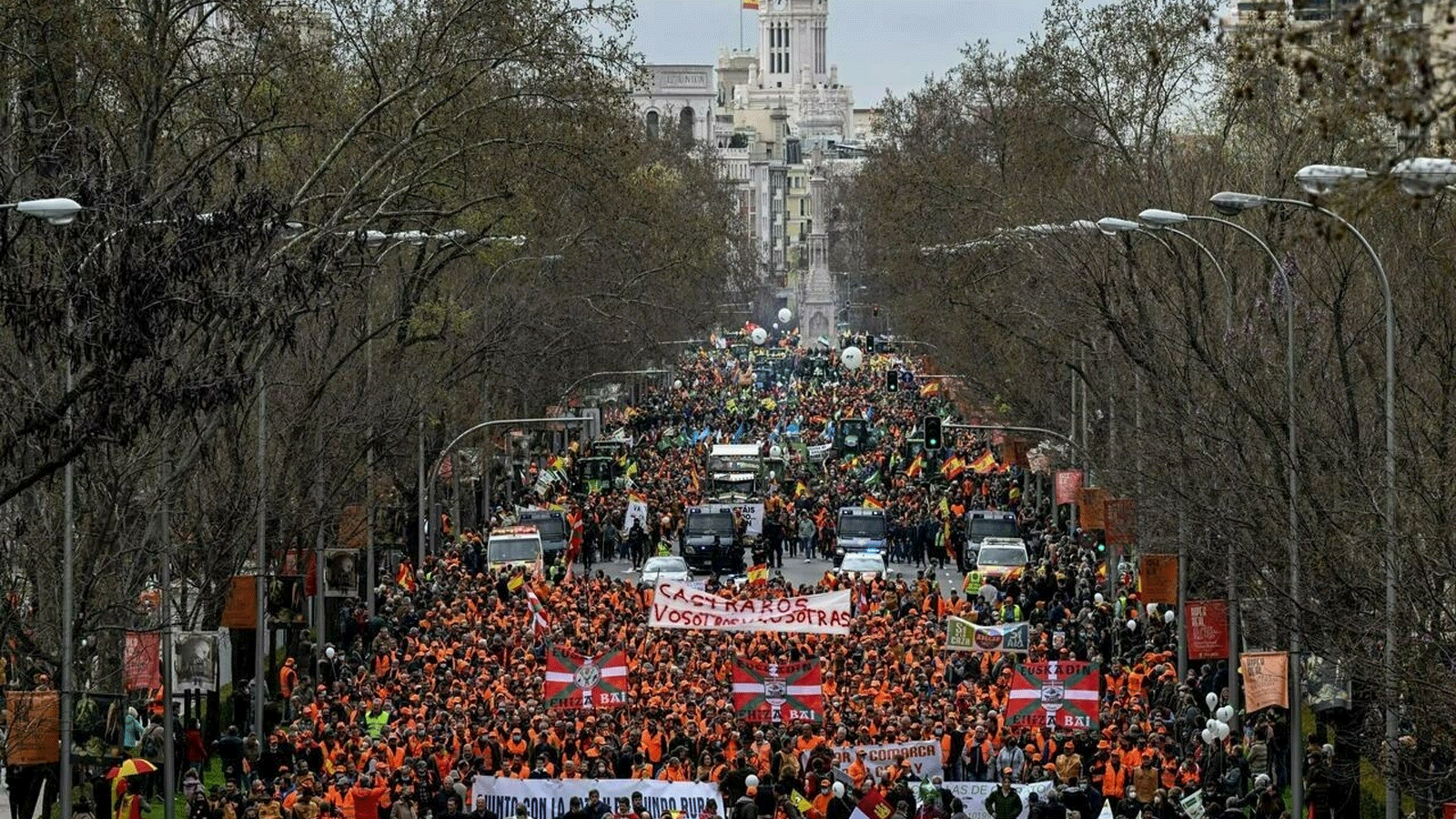 تظاهر المزارعون في وسط العاصمة الإسبانية بين وزارتي التحول البيئي والزراعة، بدعوة من منصة "التحالف الريفي" التي تقول إنها تمثّل حوالي عشرة ملايين مزارع إسباني.