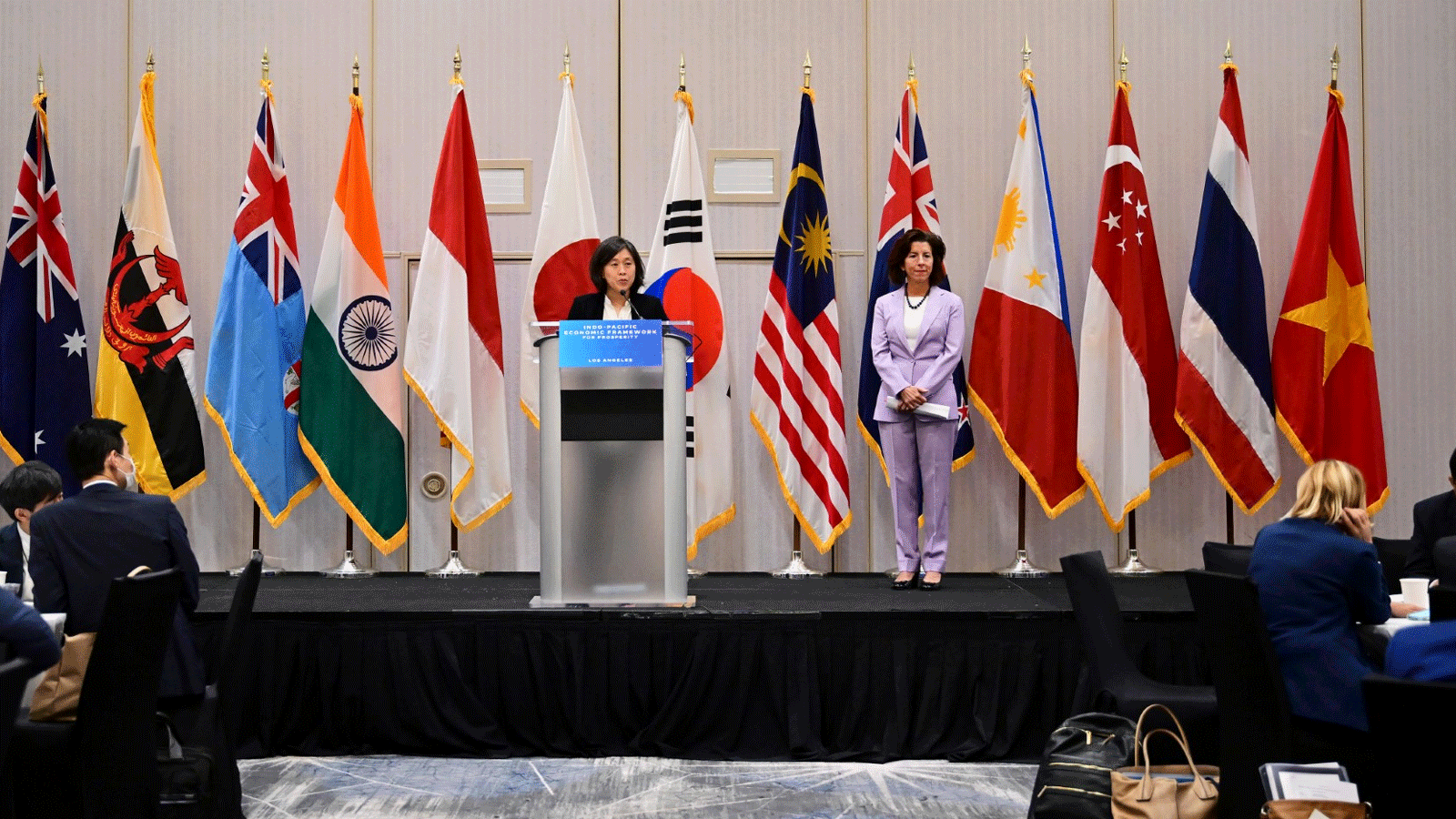 لوس انجليس: وضعت الولايات المتحدة الجمعة في لوس أنجليس أسس تحالف يضم 13 بلدا في منطقة آسيا-المحيط الهادئ يقوم على تطوير القطاع الرقمي ومصادر الطاقة المتجددة وقانون العمل ومكافحة الفساد وذلك في إطار التصدي لتمدد النفوذ الصيني في المنطقة.