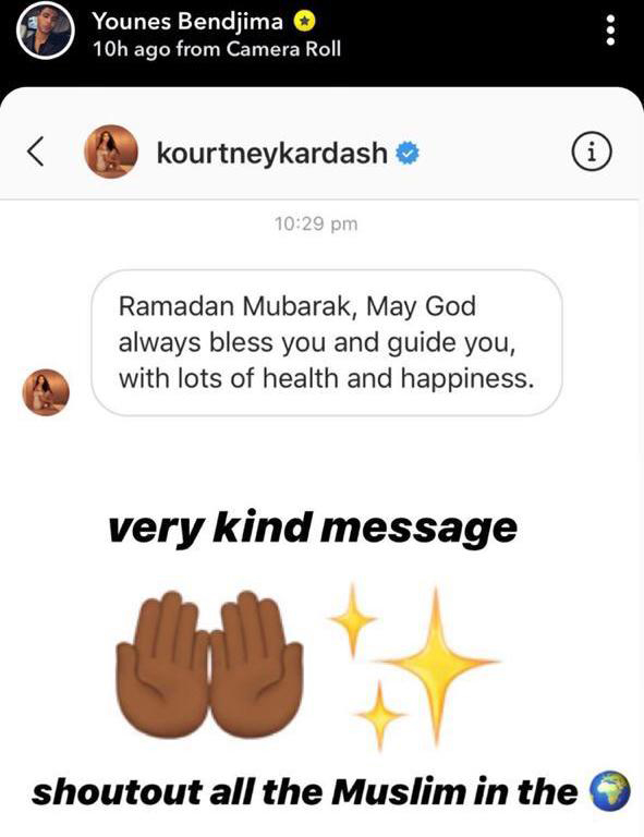 إيلاف من بيروت: قامت نجمة تلفزيون الواقع كورتني كارداشيان بإرسال تهنئة بمناسبة حلول شهر رمضان لشريكها السابق العارض الفرنسي من اصل جزائري يونس بن دجيما، من خلال خاصية الرسائل الخاصة على الإنستغرام. قالت فيها: "رمضان مبارك. أسال الله ان يباركك ويهديك واتمنى لك الصحة والسعادة".