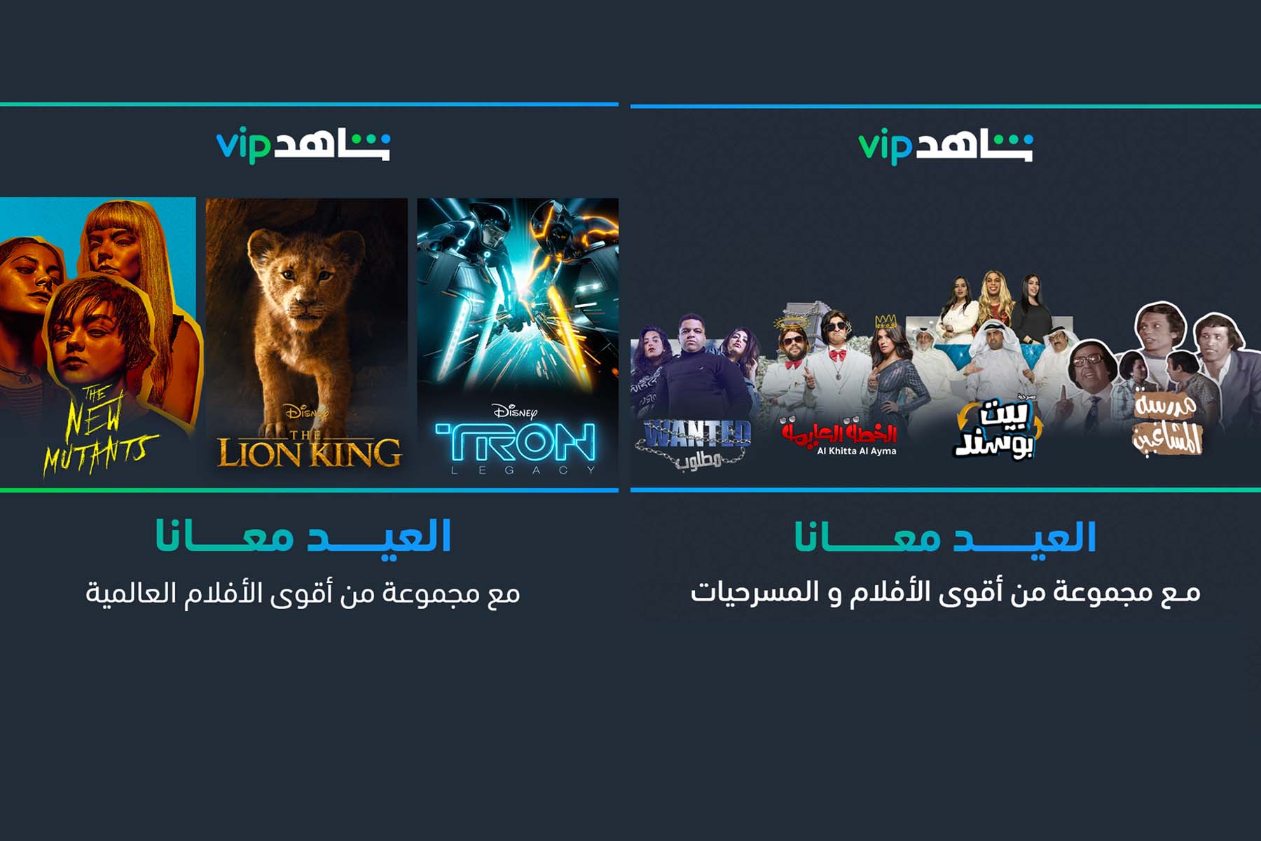 - مسرحية "مدرسة المشاغبين" بالألوان: بعد عرضها بالأبيض والأسود على مدى 47 عاماً، يقدم "شاهد VIP" في أول أيام العيد المسرحية الأكثر شهرةً وقرباً إلى قلوب المشاهدين العرب للمرة الأولى بالألوان.