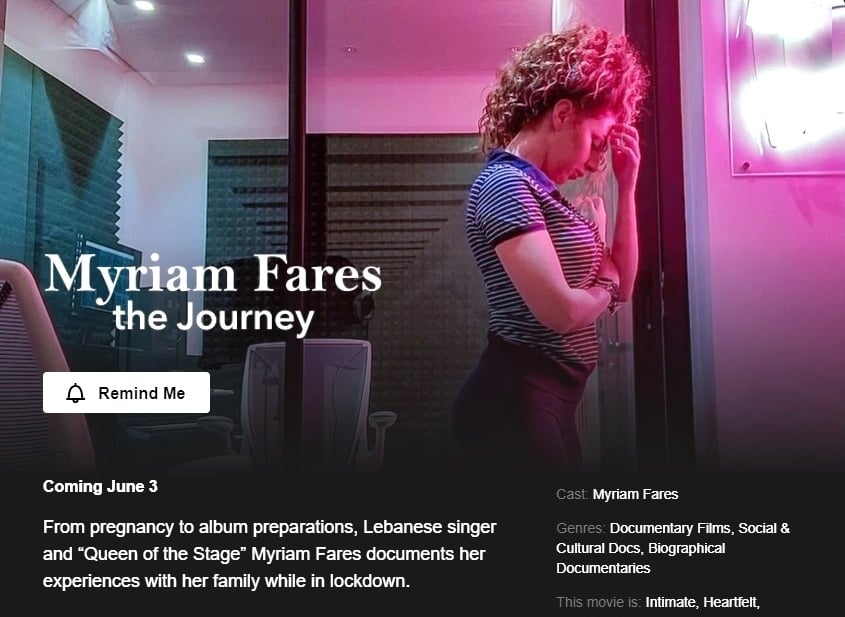 بينما طرحت المنصة الإعلان الترويجي للوثائقي الذي يستغرق ساعة و١١ دقيقة، وتتحدث فيه الفنانة اللبنانية عن فترة حملها خلال فترة العزل بسبب فيروس كورونا، ومراحل تحضير البومها السادس الذي سيصدر قريباً ويتضمن 10 أغنيات متنوع اللهجات.