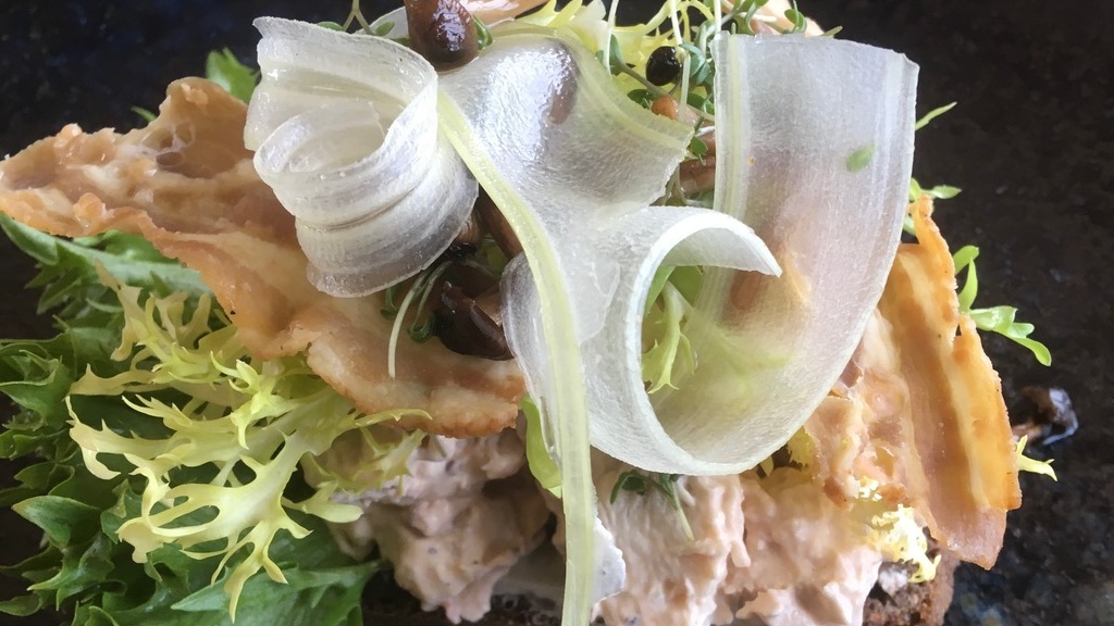 ضع سلطة الدجاج فوق شرائح الخبز، وأضف فوقها لحم الديك الرومي المقرمش، مع أي إضافات تزيين تختارها.