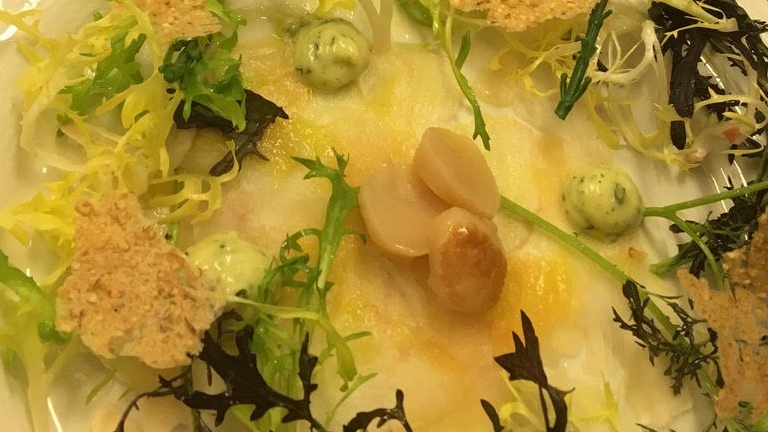 تُقدَّم هذه القطع (ويمكن طهي القطعتين في الأعلى أو تركهما نيئتين، أو حتى فرمها ناعمًا وتقديمها داخل قالب دائري) فوق طبقة من شرائح الإسكالوب النيئة الرقيقة جدًا.