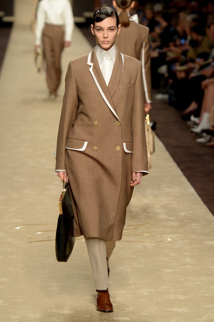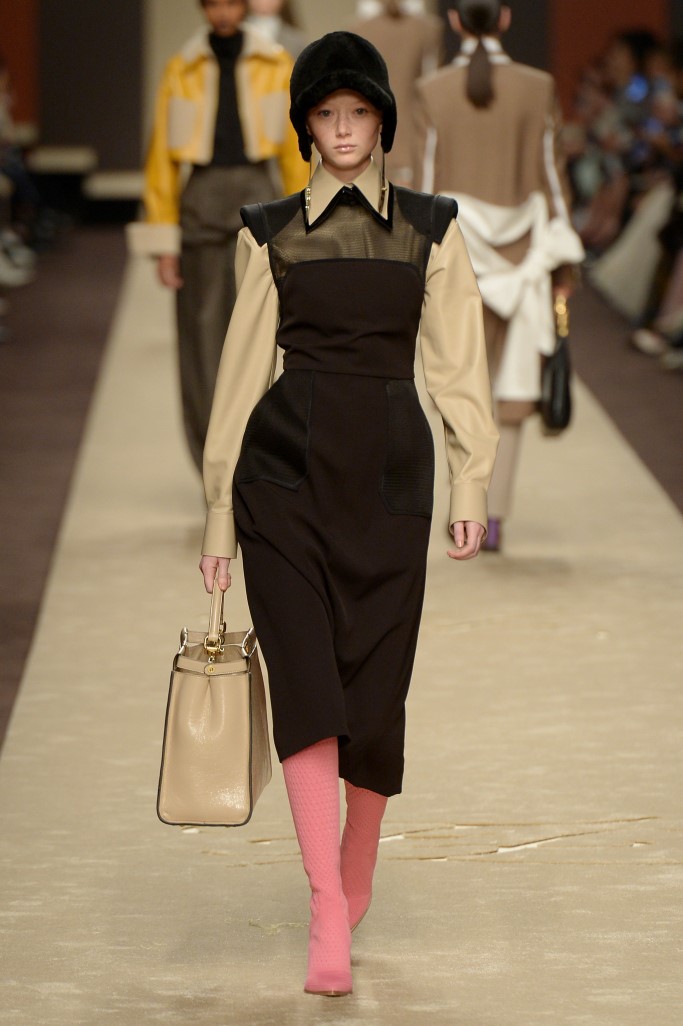 فيما قدَّمت سارة باتاغليا تشكيلة غاية في الأنثوية تبدو مستوحاة من ثمانينات القرن الماضي. وجاءت درجات البني والبيج الخاصة بتشكيلة دار فيندي الممتزجة مع درجات الأبيض والألوان الأكثر جرأة لتحول القطع إلى قطع كلاسيكية مميزة للأبد تتماشى وأحدث الصيحات.