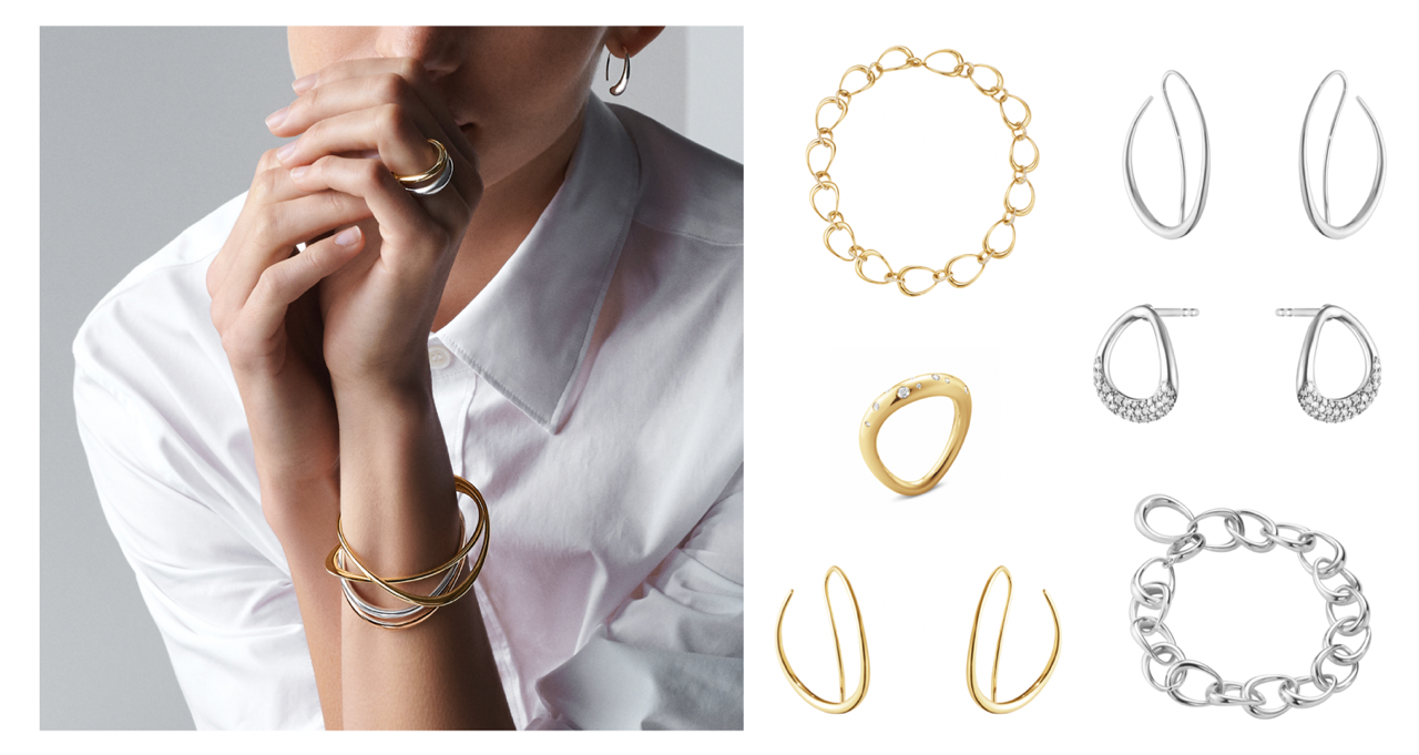 تميزت تشكيلة الإكسسوارات النسائية الجديدة التي أطلقتها علامة "جورج جنسن Georg Jensen" باسم "Offspring" بتصاميمها الانسيابية العضوية وفكرتها الرئيسية المستوحاة من شكل البيضة. واستعانة العلامة بأشكال متداخلة أضافت لجمال التصاميم.
