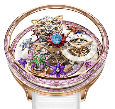 بعد فترة عمل استمرت لأكثر من عام، ها هي علامة جاكوب آند كو تطلق ساعتها الجديدة Fleurs de Jardin التي استوحت فكرتها من الآلية المتطورة لعلم الفلك الشمسي. وجاءت الساعة بتصميم ملون أنثوي يعكس مدى حرص العلامة على تقديم منتج يعكس حرفيتها ومهارتها. وغُلِّفَت الساعة بأكملها بالياقوت الوردي بإضافة 46 حجراً على القرص، 48 حجراً على الحلقة الداخلية المصنوعة من الذهب الوردي، 40 حجراً على الحافة المصنوعة من الذهب الوردي و50 حجراً على القفل الساحر المصنوع على شكل فراشة، ما أضاف لجمال الساعة ورونقها بشكل كبير.