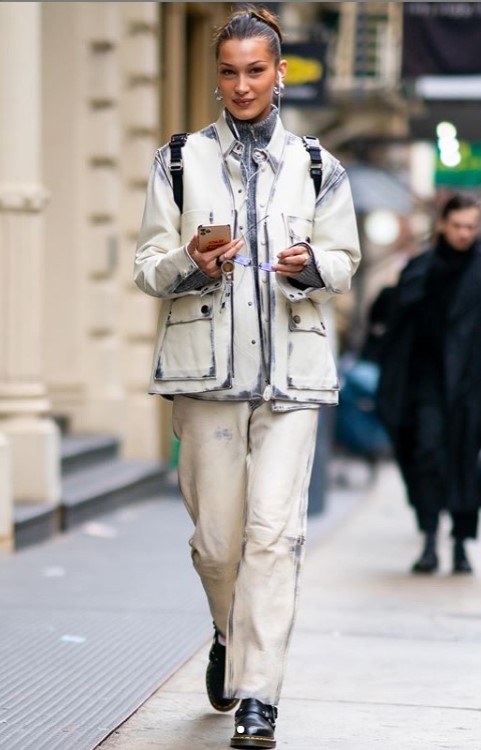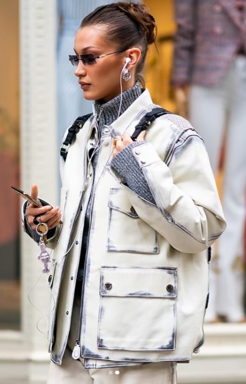 تألقت العارضة، بيلا حديد، بإطلالة من توقيع روبرت كافالي خلال تجولها مؤخراً في نيويورك، حيث ظهرت بسترة سفاري كبيرة الحجم لونها عاجي مصنوعة من الجلد ومزينة برسومات يدوية، ارتدتها فوق قميص جلدي كبير الحجم، مع سروال جلدي فضفاض من تشكيلة روبرت كافالي الرجالية لموسم خريف وشتاء 2019/ 2020.