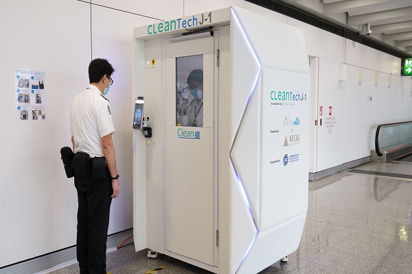 "إيلاف": بدأت السلطات في مطار هونغ كونغ الدولي تجاربها على كشك تطهير تزعم أن بمقدوره القضاء على كافة أنواع الميكروبات، التي من ضمنها فيروس كورونا، في 40 ثانية.