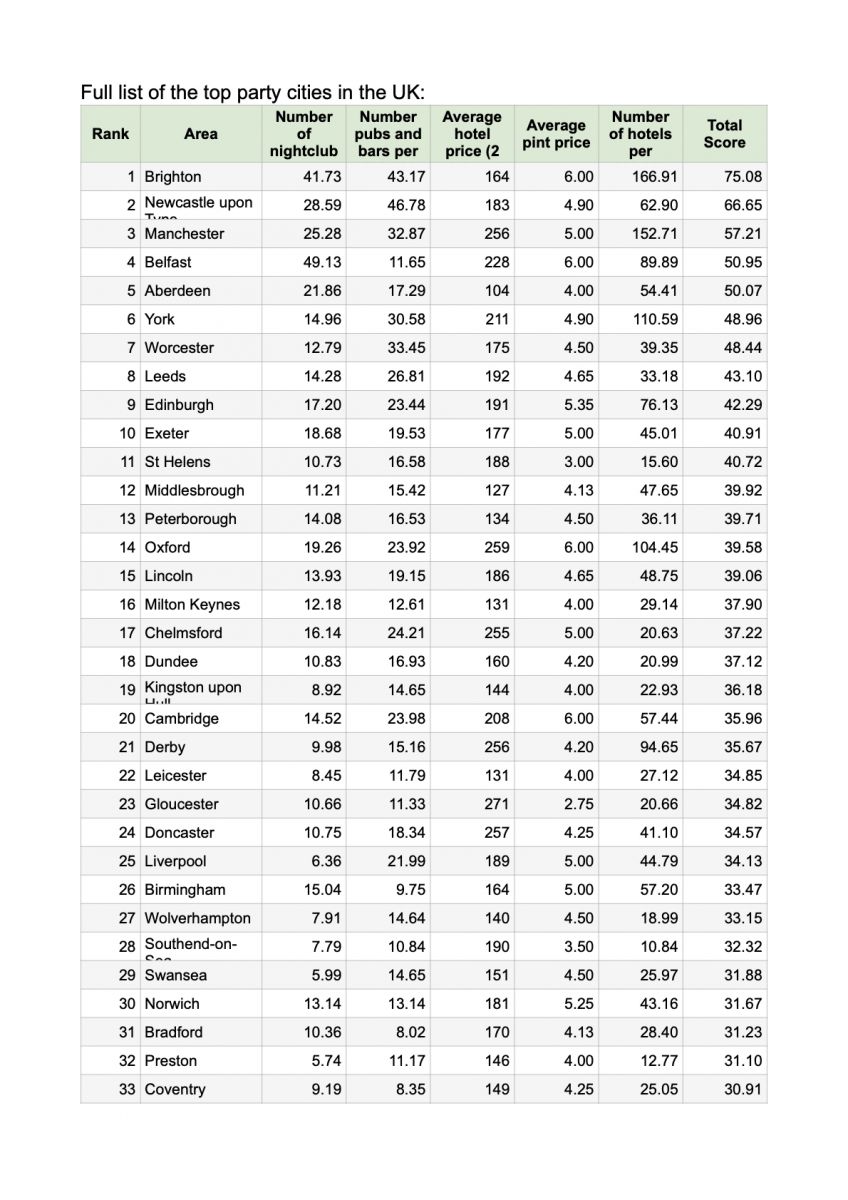 الدراسة الموسعة التي أجراها خبراء السفر في مؤسسة "أيرلندا بريستيج تورز" (Ireland Prestige Tours)، لم تكتفِ برصد الأجواء، بل استندت إلى تحليل بيانات دقيقة شملت كثافة الحانات والنوادي الليلية والفنادق لكل 100 ألف نسمة، جنباً إلى جنب مع تكلفة "الباينت" وإقامة ليلتين في الفنادق. ووفقاً للنتائج، هيمنت برايتون على القمة بفضل مشهدها الليلي شديد الكثافة؛ إذ تتميز المدينة الساحلية بواحدة من أعلى نسب تركيز الحانات والنوادي في البلاد، مما يخلق بيئة صاخبة تمتد من الواجهة البحرية إلى قلب المدينة. ورغم أن أسعارها ليست رخيصة، إلا أن التنوع الهائل والحيوية المستمرة مكّناها من التفوق على المنافسين.