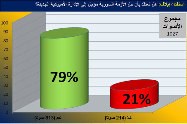 لكن، حين سألت "إيلاف" قراءها إن كانوا يظنون أن الحل السوري مؤجل إلى الإدارة الأميركية الجديدة، أجاب 1027 قارئًا عن هذا السؤال، أكدت غالبيتهم (813 مشاركًا بنسبة 79 في المئة من الأصوات) أن تلك هي الحال، وأن لا حل سريعًا لهذه الأزمة المستعصية، بينما قالت أقلية (214 مشاركًا بنسبة 21 في المئة) إن الحل غير مؤجّل.