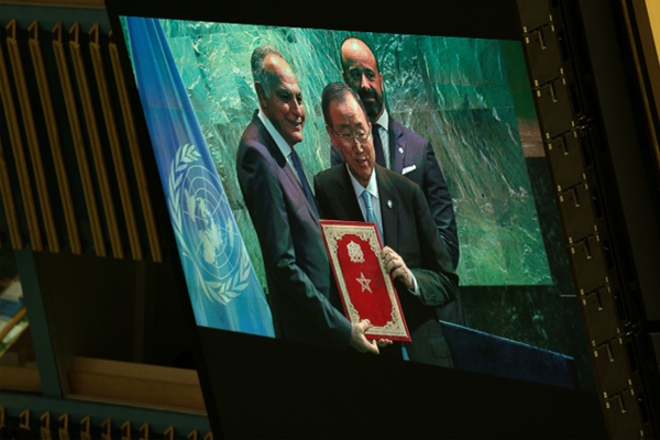 ايلاف من الرباط: وضع صلاح الدين مزوار، وزير الخارجية المغربي ورئيس مؤتمر (كوب 22)، باسم المملكة المغربية، صباح أمس في نيويورك، صكوك التصديق على "اتفاق باريس"، لدى بان كي مون، الأمين العام للامم المتحدة.وبذلك يكون المغرب قد وضع، إلى جانب 59 بلداً، صكوك التصديق على "اتفاق باريس"، وذلك في الحفل الخاص الذي احتضنته قاعة الجمعية العامة في الأمم المتحدة في نيويورك، وحضرته باتريسيا اسبينوزا، المديرة التنفيذية للاتفاقية الإطار للامم المتحدة حول المناخ، وسيغولين روايال، رئيسة مؤتمر (كوب 21).