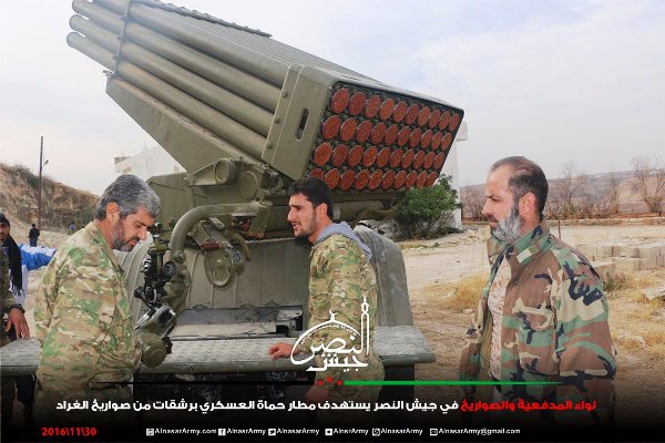 واشار المصدر إلى أنّ تنظيم "جيش النصر" قصف الشهر الماضي بنحو اربعين صاروخ غراد مطار حماة ودمر طائرة حربية واوقع عدداً من القتلى والجرحى هناك، وبث "جيش النصر" فيديو يوثق عمليات قصف المطار.