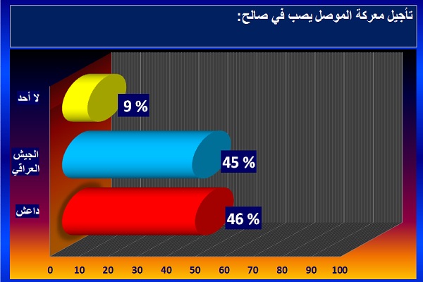 وقد رأت غالبية بسيطة من القرّاء، بلغ عددها 767، شكلت نسبتها 46 بالمائة من مجموع العدد الكلي للمشاركين في الاستفتاء، أن أي تأجيل أو توقف لمعركة الموصل يصبّ في مصلحة تنظيم داعش، الذي يحتل المدينة منذ يونيو عام 2014.