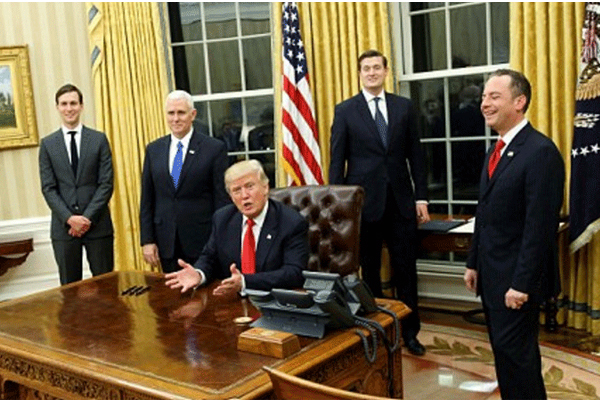 وشاهد الصحافيون التمثال النصفي لتشرشل في المكتب البيضاوي لحظة توقيع الرئيس الجديد سلسلة من الأوامر التنفيذية التي شملت بعض التعيينات الحكومية العليا وبعض التشريعات.