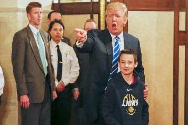 فاجأ الرئيس الأميركي دونالد ترامب نحو 100 تلميذ كانوا يقومون بجولة في البيت الأبيض الثلاثاء، وحيّاهم أمام صورة لمنافسته الديموقراطية الخاسرة هيلاري كلينتون.