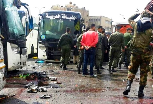 واظهرت صور بثها التلفزيون السوري الرسمي بقعا من الدماء على الارض واحذية مبعثرة ونظارات محطمة فضلا عن حافلة احترقت اجزاء منها وحافلات اخرى تساقط زجاج نوافذها واقتلعت ابوابها.