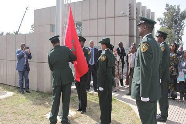 إيلاف المغرب - متابعة: جرى رفع العلم المغربي خارج مبنى المقر خلال حفل حضرته سفيرة المغرب في أثيوبيا نزهة العلوي المحمدي، ومفوض الاتحاد الأفريقي موسى فاكي محمد، والمفوضة المنتهية ولايتها دلاميني زوما، وعدد من السفراء المعتمدين في أديس أبابا.