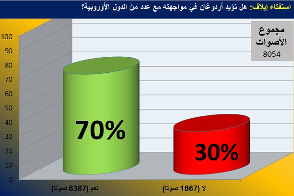 ومع استمرار هذا الصراع وأهميته وانعكاساته المستقبلية، طرحت (إيلاف) سؤال الاستفتاء أمام قرائها: هل تؤيد إردوغان في مواجهته مع عدد من الدول الأوروبية؟، وكان أن شارك في الاستفتاء نحو 8054 قارئا، ايدت غالبيتهم بنسبة 79 % (6387 مصوّتاً) الرئيس التركي في مواجهته مع الغرب، بينما لم يؤيد ما نسبته 21 % (1667 مصوّتاً) اردوغان في هذه المواجهة.