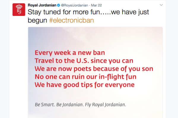 إيلاف من واشنطن: سخرت الخطوط الملكية الأردنية مجداداً الخميس، من الحظر الذي فرضته السلطات الأميركية على دخول أجهزة الحاسوب إلى الطائرات المتجهة من بلدان شرق أوسطية إلى الولايات المتحدة.