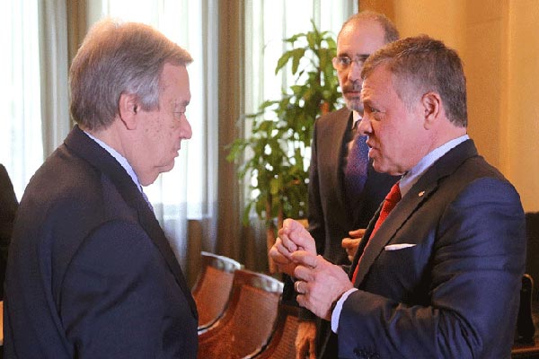 وأعرب الأمين العام للأمم المتحدة عن تقديره لدور الأردن في التعامل مع أزمات المنطقة، ومساعيه إلى تحقيق الأمن والسلم الدوليين. ولفت إلى الجهود الكبيرة التي تقوم بها المملكة في استضافة اللاجئين السوريين، ما يتطلب قيام المجتمع الدولي بتنفيذ تعهداته تجاهها.