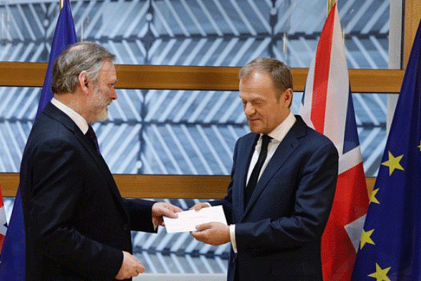 ومن المنتظر أن يعلن رئيس المجلس الأوروبي، دونالد توسك خلال 48 ساعة، عن استراتيجية خروج بريطانيا من الاتحاد. وذلك بعد تلقيه رسالة من السفير البريطاني لدى الاتحاد يوم الأربعاء وهي رسالة إخطار جرى تسليمها لمكتب توسك في بروكسل في وجود صحافيين لتفعيل عملية العد التنازلي لخروج بريطانيا من التكتل بمقتضى المادة 50 من معاهدة لشبونة التابعة للاتحاد.