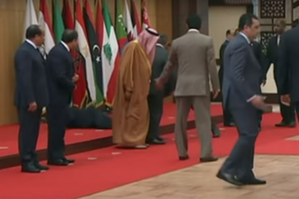 الرئيس اللبناني ميشال عون، كان آخر من تعرض لموقف السقوط أمام الكاميرات أثناء حضوره جلسة الجامعة العربية في دورتها الـ28 بالأردن، حيث تعثر عون وسقط على وجهه على الأرض أثناء دخوله القاعة لالتقاط صور تذكارية مع باقي الرؤساء.