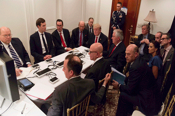 ظهرت أول صورة للرئيس الأميركي دونالد ترامب اثناء اجتماع مع أعضاء فريقه ومستشارين آخرين، بعد توجيه الضربات الصاروخية على قاعدة الشعيرات الجوية السورية فجر الجمعة.