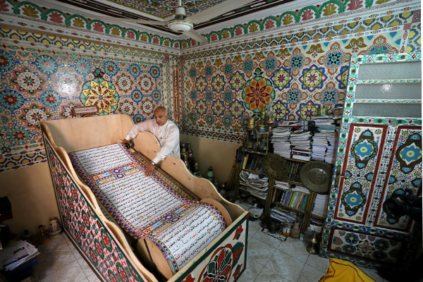 محمد الذي تغطي جدران وأسقف بيته في بلقينا، إحدى قرى مركز المحلة في محافظة الغربية بدلتا مصر، الزخارف الإسلامية المرسومة باليد، نسخ القرآن على لفة ورق طولها 700 متر.