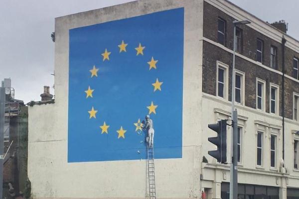 وتحمل الجدارية التي ظهرت بين ليلة وضحاها على مبنى قرب مرفأ العبّارات في ميناء دوفر سمات بانكسي بتصويرها عاملا يزيل إحدى نجوم الاتحاد الاوروبي الاثنتي عشرة.