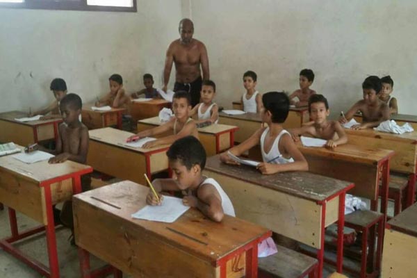 إيلاف من عدن: أدى طلاب مدرسة الضياء امتحاناتهم النهائية من دون قمصان مدرسية، في ظل تزايد وتيرة انقطاع التيار الكهربائي وارتفاع درجة الحرارة التي تشهدها مدينة عدن، العاصمة الموقتة للحكومة اليمنية الشرعية.