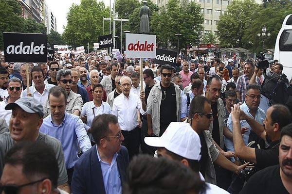 ودعا زعيم حزب الشعب الجمهوري إلى القيام بالمسيرة بعد إصدار القضاء التركي، الأربعاء، حكمًا بسجن أنيس بربر أوغلو، وهو صحافي سابق انتخب نائبًا عن الحزب، مدة 25 عامًا لتسريبه معلومات سرية إلى صحيفة.