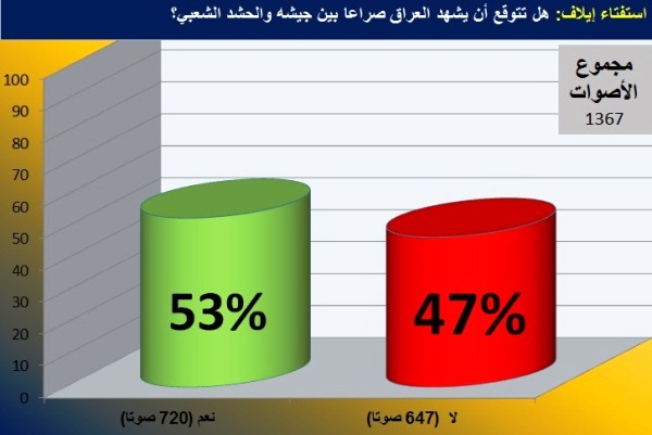 فقد وجهت "إيلاف" سؤالا الى قرائها ضمن استفتائها الاسبوعي يقول: "هل تتوقع ان يشهد العراق صراعا بين جيشه والحشد الشعبي؟" حيث ادلى 1367 قارئا بآرائهم في السؤال توقعت غالبيتهم تفجر صراع مستقبلي بين الطرفين.