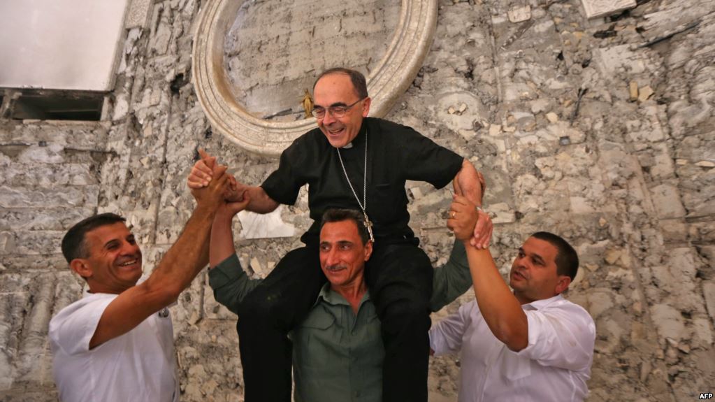 الموصل: يتلقى الكاردينال الفرنسي المونسينيور فيليب بارباران مساعدة لتسلق جدار كنيسة الروح القدس في الموصل لوضع تمثال للقديسة مريم، وذلك خلال زيارته المدينة التي هجرها المسيحيون بعد اضطهاد دام ثلاث سنوات في ظل سيطرة الجهاديين.