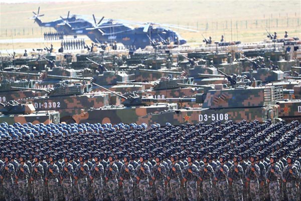 وأقيم العرض، الذي لم يُعلن عنه حتى مساء السبت، في قاعدة تشوريخه في منطقة منغوليا الداخلية ذاتية الحكم في شمال البلاد. وقال شي فيما كان يرتدي بزة عسكرية مموهة: "العالم بأسره لا يعيش بحالة سلام. يجب حماية السلام".
