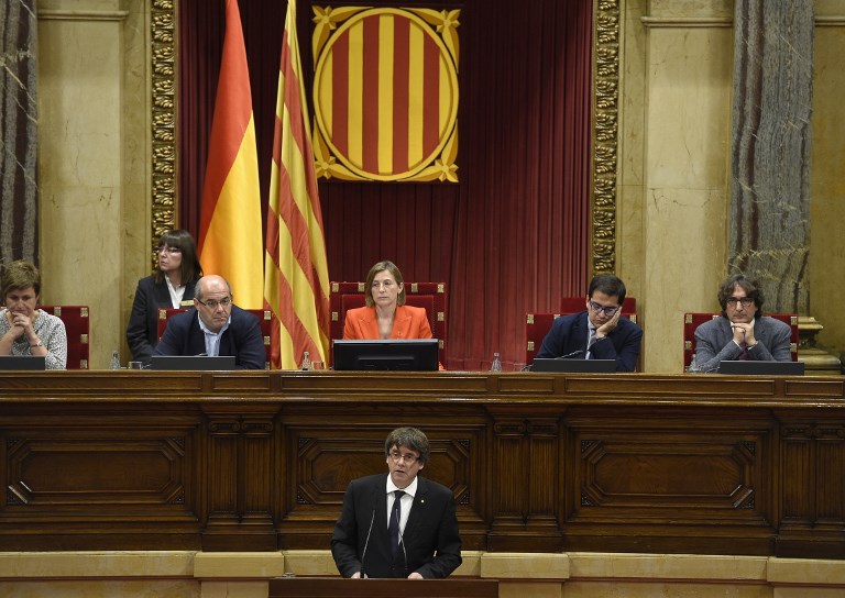 وقال بوتشيمون في خطاب القاه امام برلمان كاتالونيا وكان موضع ترقب شديد في اسبانيا والعالم "انا اقبل تفويض الشعب لكي تصبح كاتالونيا جمهورية مستقلة" لكنه طلب من البرلمان "تعليق اعلان الاستقلال من اجل بدء الحوار في الاسابيع المقبلة".