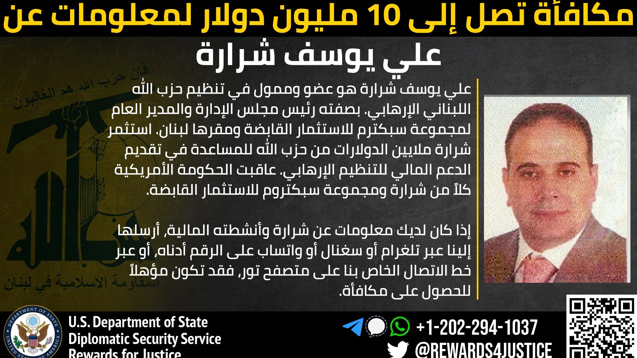 فقد قال حساب "مكافآت من أجل العدالة" التابع للخارجية الأميركية، في تغريدة: "علي يوسف شرارة هو رجل أعمال استثمر ملايين الدولارات لصالح تنظيم حزب الله اللبناني. يمكنك الحصول على مكافأة تصل إلى 10 ملايين دولار إذا كانت لديك معلومات عنه أو عن أنشطته عن طريق إرسالها إلى برنامج مكافآت من أجل العدالة".