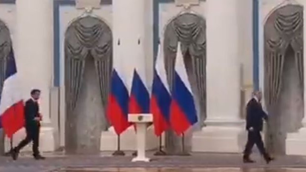 الرئيس الروسي #بوتين يمشي تاركا خلفه نظيره الفرنسي #ماكرون ليلحق به بعد الإنتهاء من المؤتمر الصحفي الذي جمع بينهما في الكرملين ..