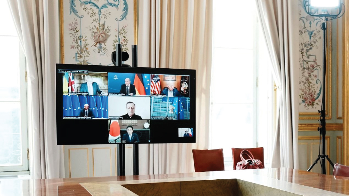 وخلال اجتماع عبر الفيديو شارك فيه الرئيس الاوكراني فولوديمير زيلينسكي، كرر رؤساء دول وحكومات ألمانيا وكندا والولايات المتحدة وفرنسا وايطاليا واليابان والمملكة المتحدة "تعهدهم اتخاذ اجراءات جديدة لمساعدة أوكرانيا في ضمان مستقبل حر وديموقراطي" و"الدفاع عن نفسها وصد اعمال عدائية مقبلة"، بحسب البيان الذي صدر اثر الاجتماع.