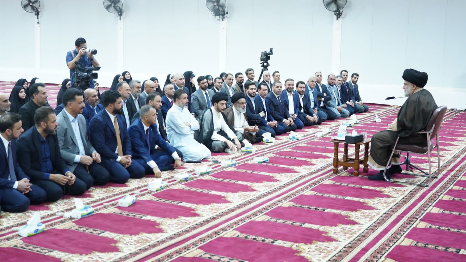 ثم أهدى زعيم التيار الصدري نواب كتلته المستقيلين، كتابا من تأليفه وآية الكرسي بخط والده الراحل محمد صادق الصدر.
