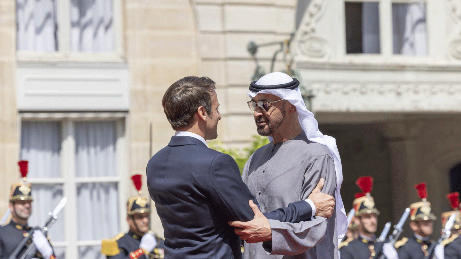 بعد ذلك عُزف السلام الوطني لكل من دولة الإمارات وفرنسا، واصطفت ثلة من حرس الشرف تحية للشيخ محمد بن زايد، ثم قدم له قائد الحرس الوحدات العسكرية المشاركة في مراسم الاستقبال.