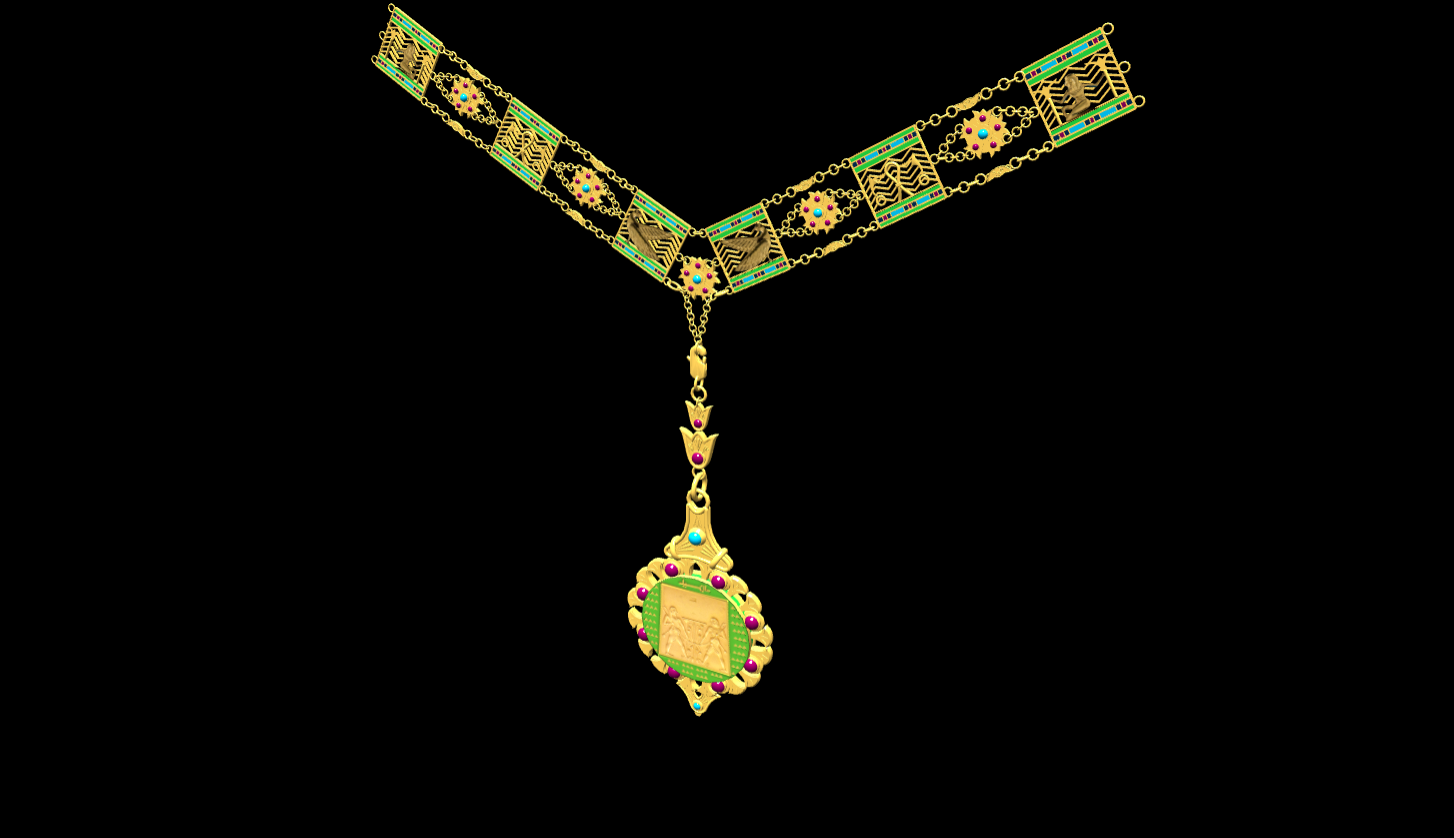 تتكوّن من وحدات مربعة مزخرفة بالمينا الملوّنة والرموز الفرعونية، تتصل ببعضها عبر سلسلتين متوازيتين تتخللهما زهور اللوتس، رمز النقاء والخلود في الحضارة المصرية.