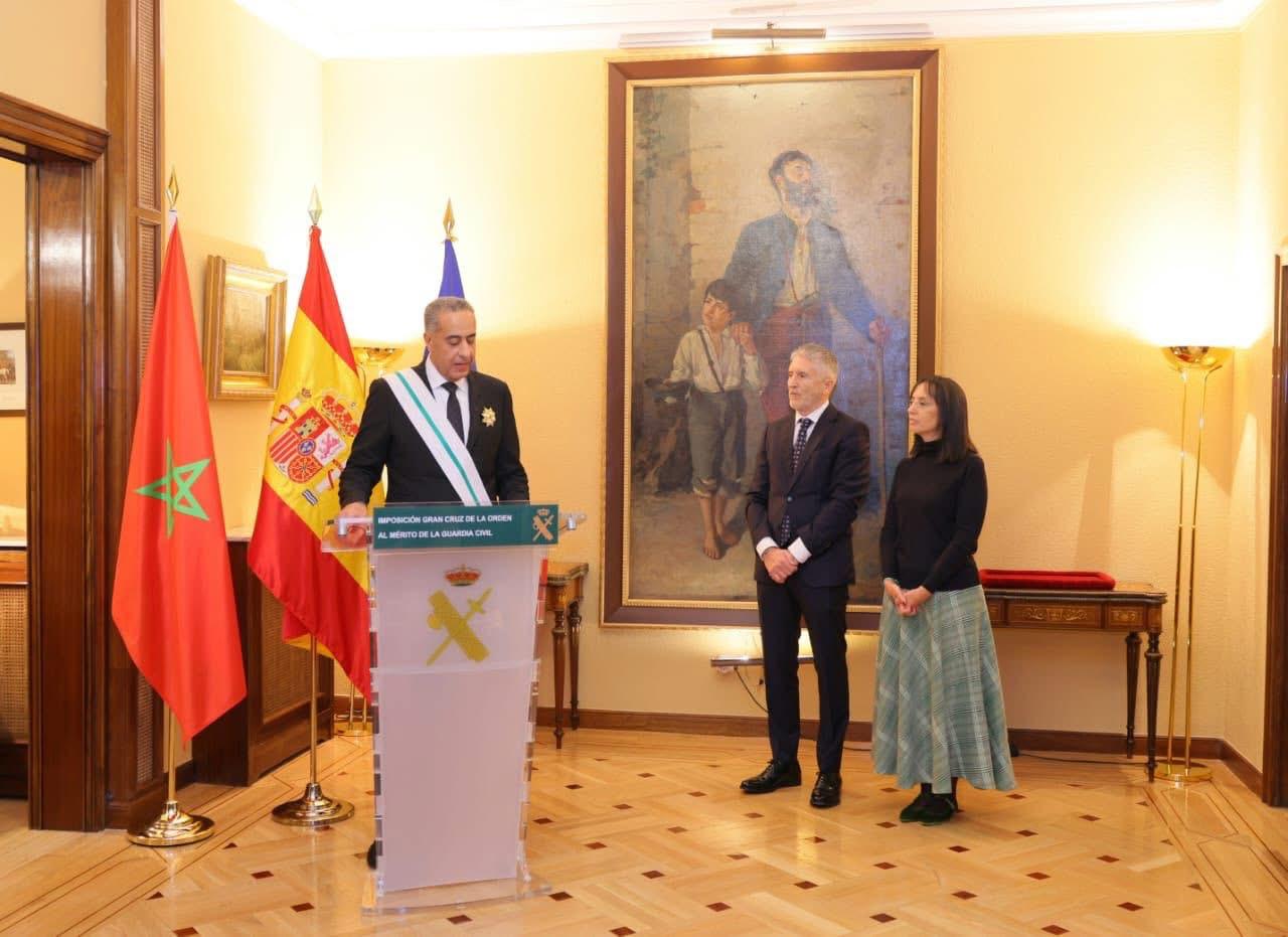 إيلاف من الرباط: أشرف وزير الداخلية الإسباني فرناندو غراندي مارلاسكا، الثلاثاء، بالعاصمة الإسبانية مدريد، على الحفل الرسمي لتوشيح المدير العام للأمن الوطني (الامن العام) ومراقبة التراب الوطني (مخابرات داخلية) عبد اللطيف حموشي بوسام الصليب الأكبر للاستحقاق للحرس المدني، الذي يعد أرفع وأسمى وسام تمنحه هذه المؤسسة الأمنية للشخصيات الأجنبية.