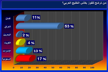 وحصل "أسود الرافدين" على نسبة بلغت 53% من إجمالي الأصوات، حيث يرون في المنتخب العراقي الأقرب لنيل اللقب الخليجي، خاصة بعدما بلغ المربع الذهبي متصدراً للمجموعة الثانية بانتصارين وتعادل، ومحافظا على سجله خالياً من الخسائر، فضلا عن تسجيله ستة أهداف بمعدل هدفين في المباراة الواحدة مقابل تلقي شباكه لهدفين فقط.