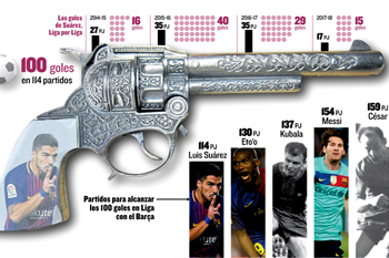 دخل المهاجم الأوروغوياني لويس سواريز تاريخ نادي برشلونة في بطولة الدوري الإسباني بعدما أصبح أسرع لاعب يصل إلى 100 هدف ، متجاوزاً بذلك الكاميروني صامويل إيتو والمجري لاديسلاو كوبالا والأرجنتيني ليونيل ميسي، أفضل هداف في تاريخ النادي والبطولة.