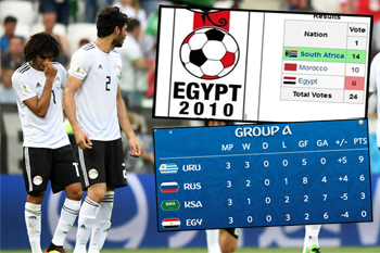 وكانت مصر قد حصلت على صفرها الأول في عام 2004 خلال تقدمها بملف لمنافسة جنوب افريقيا والمغرب على استضافة بطولة كأس العالم 2010 ، حيث لم يحصل الملف المصري على أي صوت من اصوات اعضاء المكتب التنفيذي للاتحاد الدولي لكرة القدم (فيفا) ، إذ انقسمت الأصوات - حينها- بين جنوب افريقيا التي نالت شرف التنظيم بـ 14 صوتاً، والمغرب الذي حل ثانياً بـ 10 اصوات من اصل 24 صوتاً يمثلون تنفيذية "الفيفا".