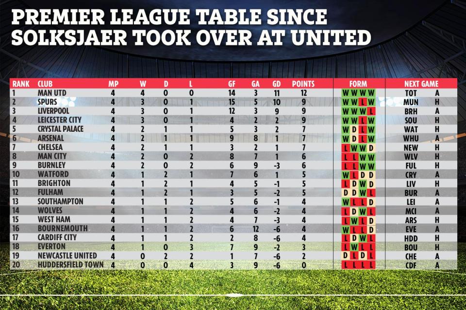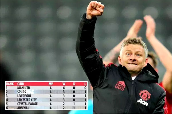 هذا وجمع مانشستر يونايتد 12 نقطة تحت إشراف سولسكاير ، فيما سجل خط هجومه 14 هدفاً مقابل تلقي حارسه الإسباني دافيد دي خيا ثلاثة اهداف فقط ، حيث يتفوق "اليونايتد" بفارق ثلاث نقاط عن توتنهام هوتسبير ، كما يتفوق أيضاً على المتصدر ليفربول الذي حصد هو الآخر تسع نقاط فقط من اربع جولات.